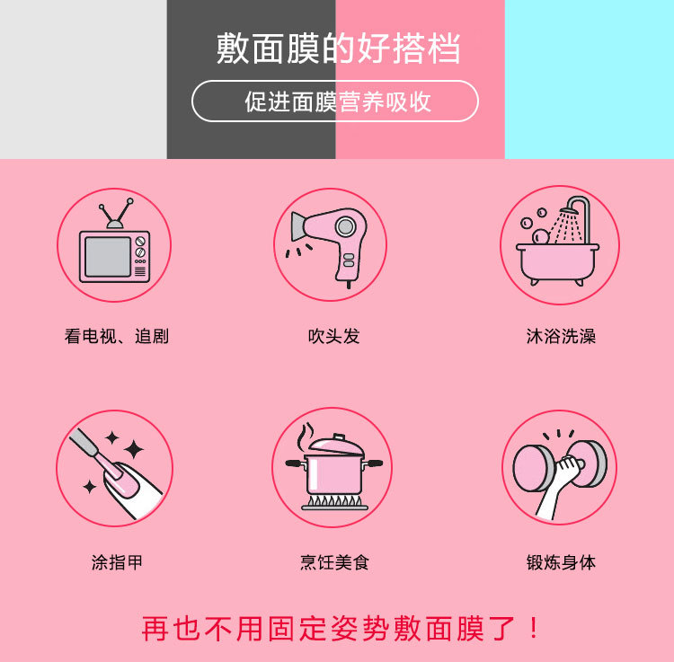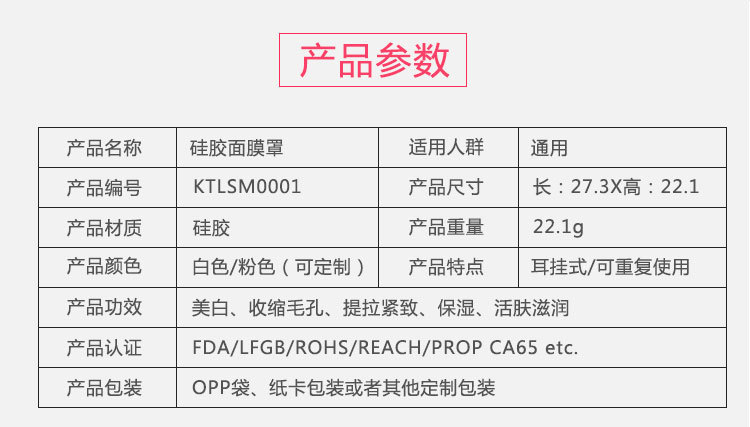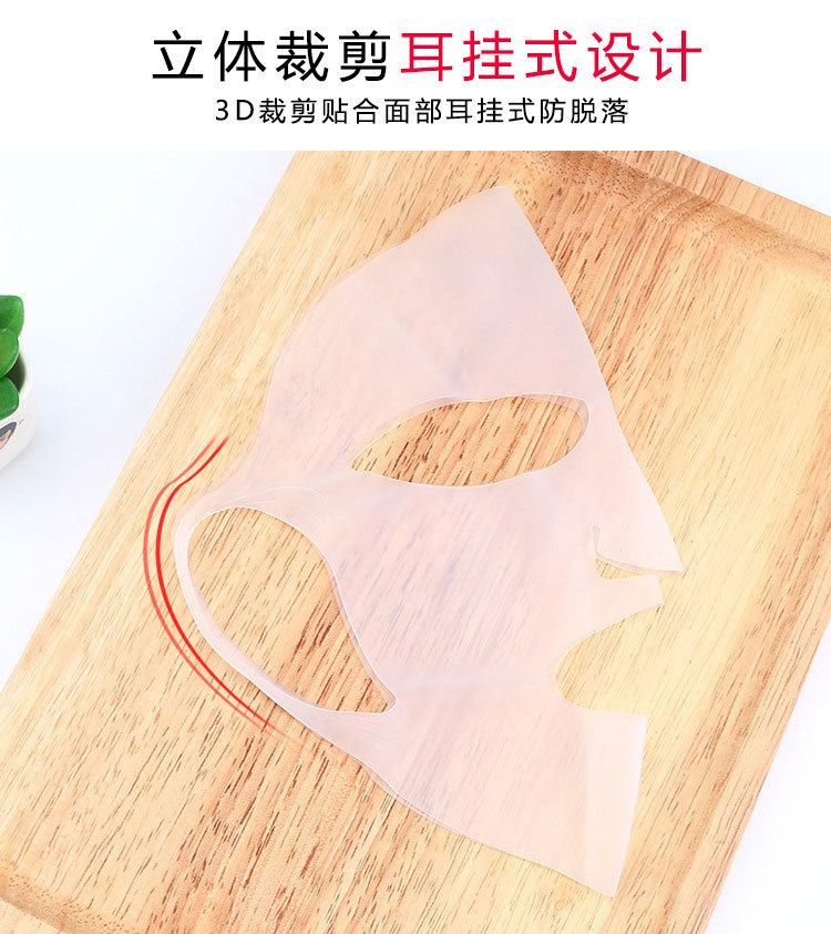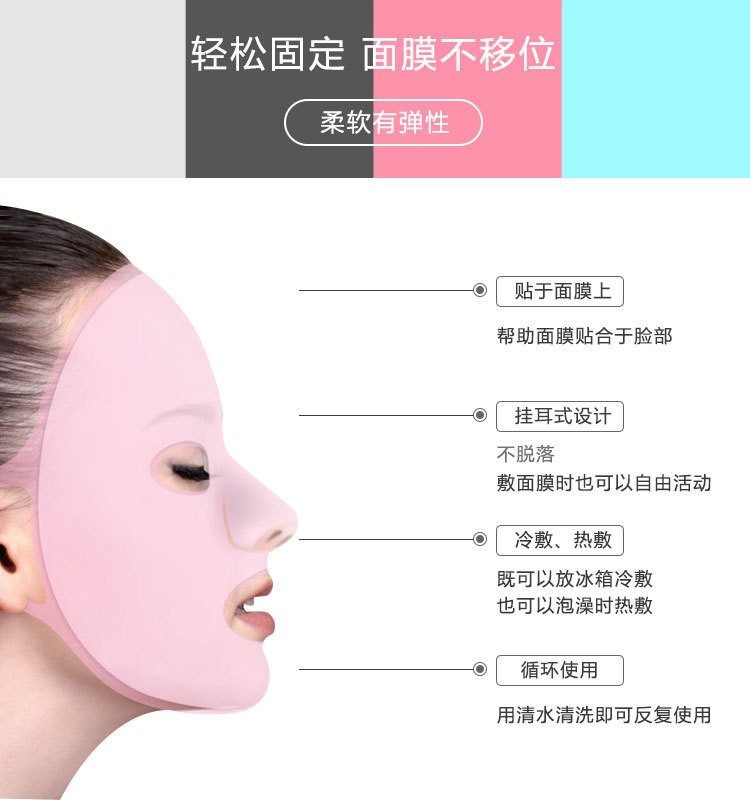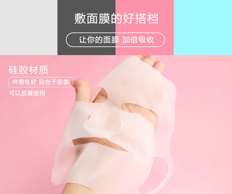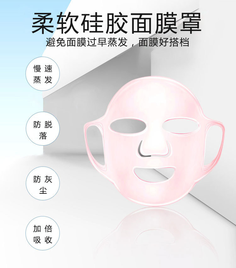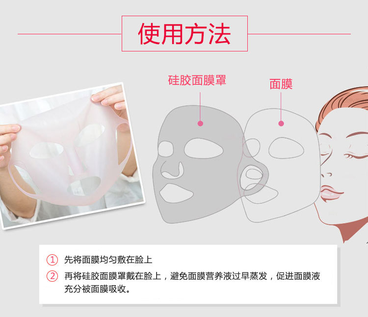 特點:環(huán)保硅膠材質(zhì),反復(fù)清洗使用,伸展性良好,貼合臉部有效防止面膜精華和水分過早蒸發(fā),影響吸收;面膜罩耳掛設(shè)計,有效防止面膜移位或脫落,適合各種臉型。