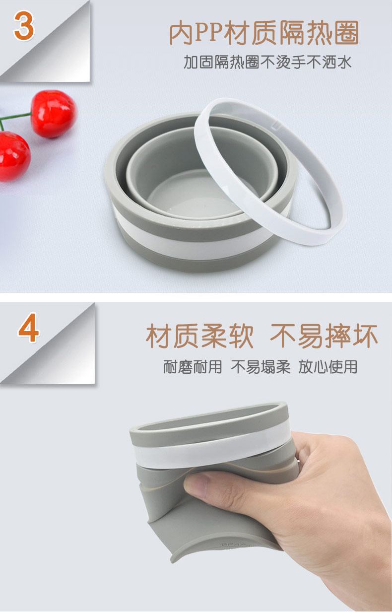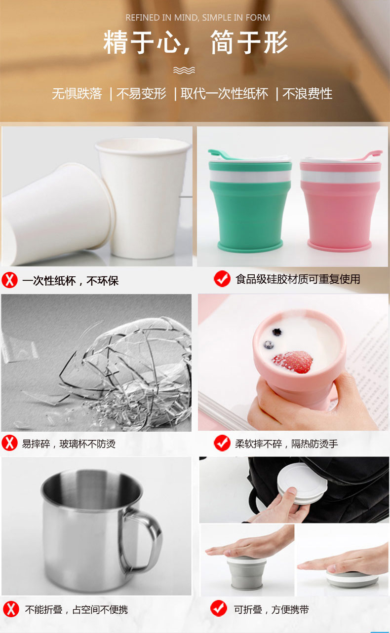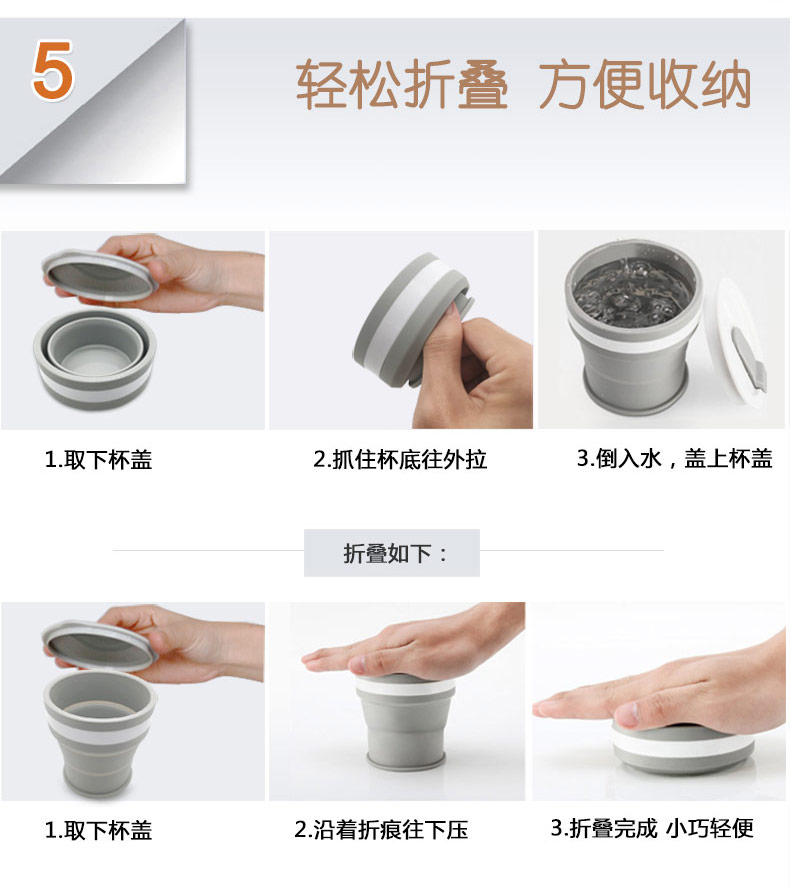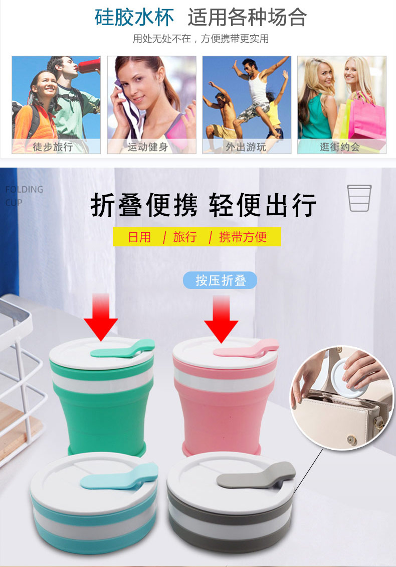 折疊式硅膠水杯成為運動以及郊游的便攜物品之一,水喝完后直接折疊放入口袋減小儲物空間替代了對水壺和瓶裝礦泉水的不足, 完全顛覆了消費者對硅膠折疊水杯的看法,硅膠折疊杯是一種攜帶方便、使用衛(wèi)生、具有雙層杯壁的折疊杯。外壁的兩個相鄰段通過螺紋連接,內(nèi)壁的兩個相鄰段為錐形配合,可上下移動。通過外壁螺紋旋轉驅(qū)動內(nèi)壁上下展開,實現(xiàn)杯形折疊和拉伸動能。