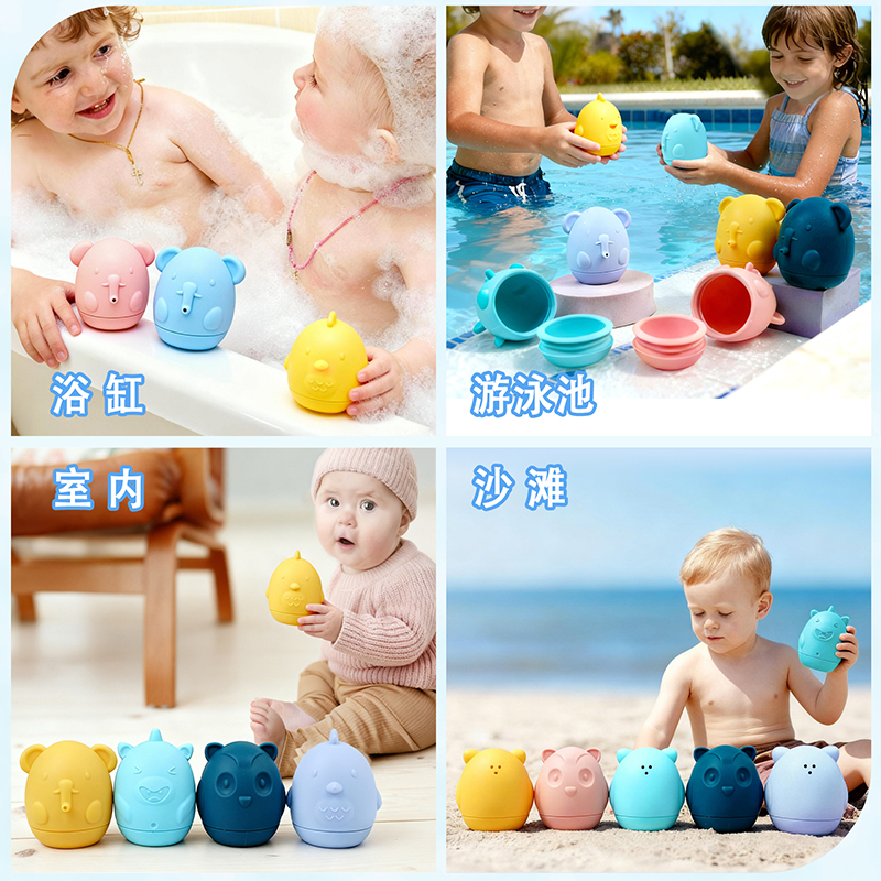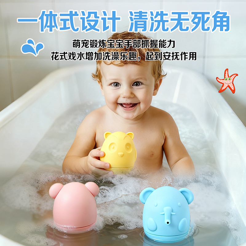 食品級(jí)硅膠擠水玩具硅膠嬰兒沐浴噴水兒童洗澡益智寶寶戲水4件套